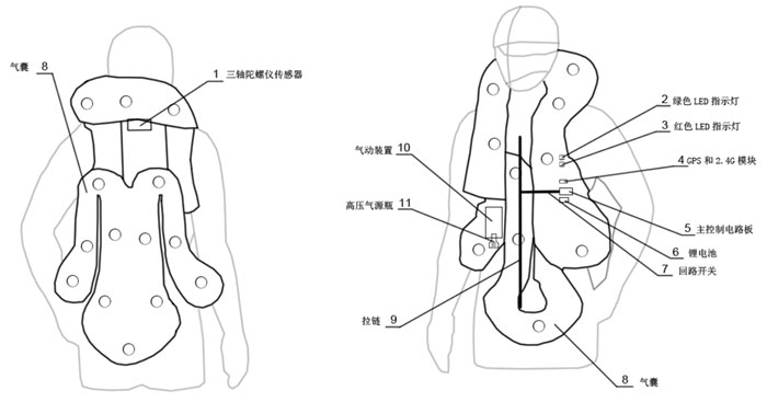 為了防止衣服在未穿戴時(shí)觸發(fā)氣囊,特意設(shè)計(jì)了保護(hù)系統(tǒng),拉鏈在未拉狀態(tài),整個(gè)系統(tǒng)處于關(guān)閉狀態(tài),當(dāng)拉鏈正常拉好后,系統(tǒng)工作狀態(tài)進(jìn)行自檢,自檢完成后LED綠燈亮起,系統(tǒng)自檢有故障或者電池電量不夠時(shí)LED紅燈亮起,整個(gè)系統(tǒng)帶有自檢功能。